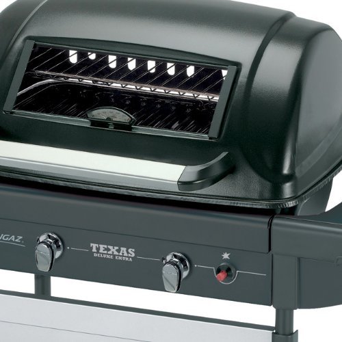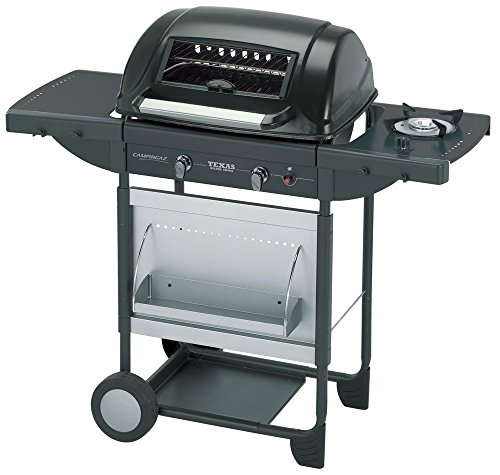 Pratico Barbecue a Gas Campingaz Texas Revolution utilizzabile con pietre laviche che permettono una maggiore distribuzione uniforma del calore. E’ dotato di due bruciatori con una potenza di 8,2 kW, e di un fuoco laterale con una potenza di 2,3 kW. Adatto per il trasporto, ha due ruote che agevolano i movimenti. Accessoriato: troverete un utilissimo ripiano laterale pieghevole, uno spazio ripostiglio inferiore e un coperchio in acciaio con finestra in vetro e termometro. Molto utile la vaschetta raccogli grassi che vi aiuterà nella pulizia del vostro apparecchio. Il barbecue deve essere utilizzato con bombola a gas di serie. Tubo e regolatore pressione non inclusi.