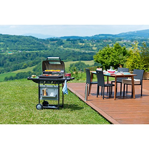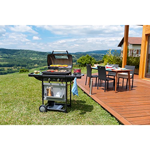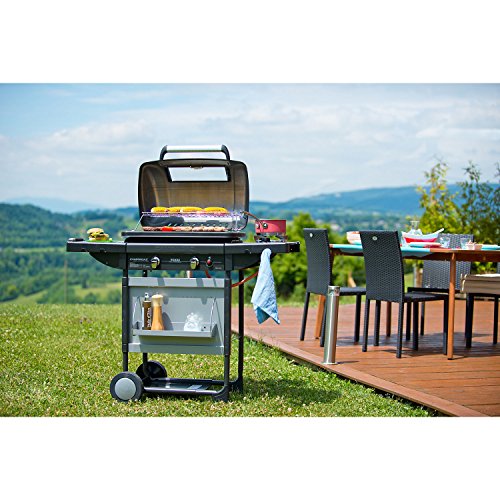 Barbecue a gas perfetto per essere trasportato grazie alle utilissime ruote bloccanti. Una volta posizionato vi basterà bloccare le ruote e tutto rimarrà fermo e stabile. La superficie di cottura è in ghisa e i due bruciatori sono in acciaio inox. La potenza è di 8,2 kW. Lateralmente troverete da un lato un ripiano pieghevole e dall’altro un fornello con una potenza di 2,3 kW. Vi sarà molto utile per poter cuocere altre pietanze(ad esempio contorni) o per poter riscaldare il cibo già cotto. Dotato di coperchio, potrete provare diversi tipi di cotture(diretta e indiretta). Questo coperchio è dotato di un utile finestra in vetro che vi permetterà di poter tenere sempre sotto controllo la cottura del vostro cibo. Un ampio spazio inferiore sarà perfetto per poter riporre tutto ciò che vi serve. E’ consigliabile effettuare sempre la giusta manutenzione sull’apparecchio per poter avere una lunga durata nel tempo. E’ il modello perfetto da poter utilizzare in scampagnate fuori porta. Potrete passare ottime serate in compagnia di amici e di buon cibo grigliato. Ha un buon rapporto qualità prezzo.
